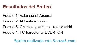 Lista de participantes: Chelsea y atlético - real Madrid, Valencia cf-Arsenal, FC barcelona- EVERTON, AC milan- Lazio.
