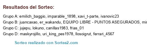 Lista de participantes: canillas1983, emilich_baggio, er_wakandu, ferrari_4567, frias_01, imparable_1898, ivanovic23, juancaxao, jujepu, lokuno, maskyrojillo, mirocal01, EQUIPO LIBRE - PUNTOS ASEGURADOS, uri_king_pes1978, xavi_t-parte, llosoigrut.