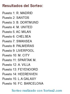 Lista de participantes: B. DORTMUND, SPARTAK M., SANTOS, FEYENOORD, M. UNITED, HEERENVEN, AC MILAN, L.A GALAXY, CHELSEA, LIVERPOOL, SWANSEA, PALMEIRAS, M. CITY, FC. BARCELONA, R. MADRID, A. VILLA.