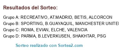 Lista de participantes: AT.MADRID, TORINO, PSG, EVIAN, PARMA, VALENCIA, B.LEVERKUSEN, RECREATIVO, MANCHESTER UNITED, BETIS, ROMA, ELCHE, B.GUAYAQUIL, SHAKHTAR, ALCORCON, SPORTING.