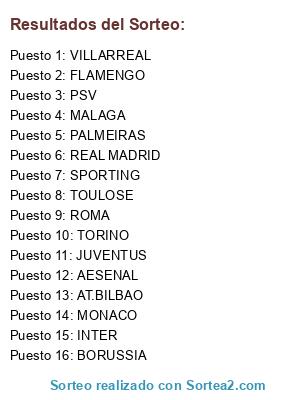 Lista de participantes: AESENAL, BORUSSIA, PALMEIRAS, TORINO, REAL MADRID, INTER, JUVENTUS, TOULOSE, PSV, FLAMENGO, AT.BILBAO, MONACO, VILLARREAL, SPORTING, ROMA, MALAGA.