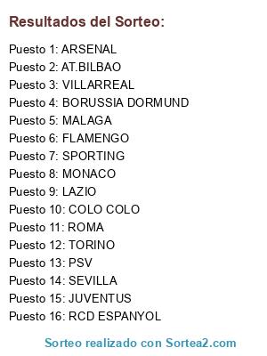 Lista de participantes: SPORTING, VILLARREAL, COLO COLO, ROMA, PSV, TORINO, ARSENAL, RCD ESPANYOL, MALAGA, JUVENTUS, FLAMENGO, LAZIO, BORUSSIA DORMUND, AT.BILBAO, SEVILLA, MONACO.