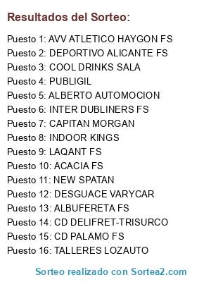 Lista de participantes: CAPITAN MORGAN, TALLERES LOZAUTO, INDOOR KINGS, PUBLIGIL, CD DELIFRET-TRISURCO, COOL DRINKS SALA, ALBUFERETA FS, NEW SPATAN, ALBERTO AUTOMOCION, ACACIA FS, DEPORTIVO ALICANTE FS, AVV ATLETICO HAYGON FS, CD PALAMO FS, INTER DUBLINERS FS, DESGUACE VARYCAR, LAQANT FS.