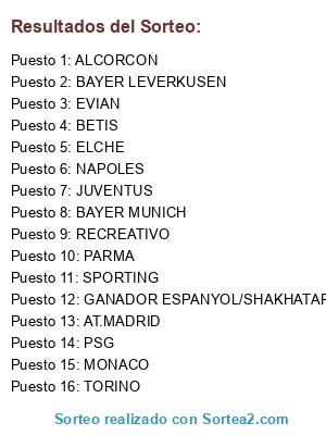 Lista de participantes: AT.MADRID, PSG, BETIS, BAYER LEVERKUSEN, BAYER MUNICH, RECREATIVO, ELCHE, PARMA, JUVENTUS, EVIAN, MONACO, ALCORCON, SPORTING, TORINO, NAPOLES, GANADOR ESPANYOL/SHAKHATAR.