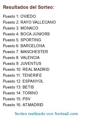 Lista de participantes: SPORTING, TENERIFE, REAL MADRID, BOCA JUNIORS, VALENCIA, PSV, BARCELONA, MANCHESTER, ESPANYOL, OVIEDO, AT.MADRID, BETIS, RAYO VALLECANO, MONACO, TORINO, JUVENTUS.