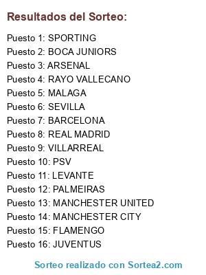 Lista de participantes: VILLARREAL, SPORTING, MALAGA, PSV, PALMEIRAS, MANCHESTER UNITED, FLAMENGO, BARCELONA, BOCA JUNIORS, MANCHESTER CITY, ARSENAL, SEVILLA, RAYO VALLECANO, JUVENTUS, LEVANTE, REAL MADRID.
