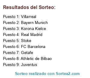 Lista de participantes: Korona Kielce, Getafe, Bayern Munich, Stoke, Villarreal, Athletic de Bilbao, FC Barcelona, Juventus, Real Madrid.