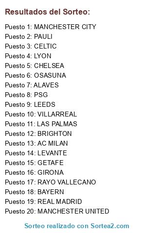 Lista de participantes: MANCHESTER UNITED, MANCHESTER CITY, VILLARREAL, LEEDS, LAS PALMAS, GIRONA, LYON, LEVANTE, BRIGHTON, GETAFE, PSG, AC MILAN, REAL MADRID, PAULI, OSASUNA, BAYERN, RAYO VALLECANO, CHELSEA, ALAVES, CELTIC.