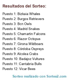 Lista de participantes: Cantabria Bulls, Vicar Bees, Bizkaia Whales, Madrid Snakes, Girona Wildboars, Chamartin Falcons, Riazor Octopus, Burgos Retrievers, Bcn Owls, Córdoba Ospreys, Alcolea Crabs, Badajoz Vultures.
