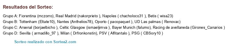 Lista de participantes: PSG ( CBSory10 ), Racing de avellaneda (Girones_Canarios ), Oporto ( pacopaquet ), Bayer Munich (falumo), Real Madrid (nakorprieto ), Sevilla ( armadillo_97 ), Fiorentina (mczorro), Napoles ( chacholoco31 ), Celtic Glasgow (ismaeljimva ), UD Las palmas ( Renovac), Milan ( Drfronkonstin), PSV ( Alfitantalo ), Arsenal (borjaelbicho ), Nantes (Anthelios78), Betis ( wisa23), Tottenham (Eltate10).