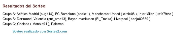 Lista de participantes: Liverpool ( benja80369 ), Valencia (put_amo13), FC Barcelona (andie1 ), Manchester United ( circle08 ), Atlético Madrid (puga14), Inter Milan ( rafa79vlc ), Chelsea ( Montxo91 ), Bayer leverkusen (El_Troska), Palermo, Dortmund.