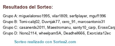 Lista de participantes: Duvnjak77, mguf1996, Exorcista12ec, Nono2114, cero_91, Tomi-cabj02, vilar1809, casanerds2011, santy10_carp, wheelpamSA, miguelalonso1995, serfiplayer, Deadhell666, marcoantonio31, Maestromanu, ErossCarp.