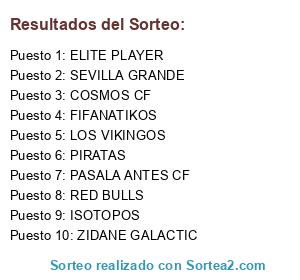 Lista de participantes: COSMOS CF, PIRATAS, PASALA ANTES CF, ZIDANE GALACTIC, FIFANATIKOS, ISOTOPOS, ELITE PLAYER, LOS VIKINGOS, RED BULLS, SEVILLA GRANDE.