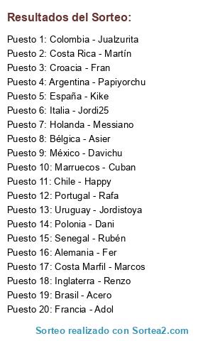 Lista de participantes: Francia - Adol, Brasil - Acero, Alemania - Fer, Inglaterra - Renzo, Bélgica - Asier, Portugal - Rafa, Holanda - Messiano, Argentina - Papiyorchu, Uruguay - Jordistoya, Senegal - Rubén, España - Kike, Italia - Jordi25, Colombia - Jualzurita, Croacia - Fran, Polonia - Dani, Marruecos - Cuban, México - Davichu, Chile - Happy, Costa Marfil - Marcos, Costa Rica - Martín.