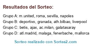 Lista de participantes: napoles, betis, ac.milan, ath.bilbao, sevilla, atl.madrid, liverpool, deportivo, fenerbache, galatasaray, m.united, mallorca, ajax, roma, malaga, granada.
