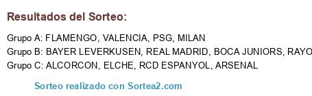 Lista de participantes: RCD ESPANYOL, FLAMENGO, ALCORCON, ELCHE, ARSENAL, BOCA JUNIORS, MILAN, RAYO VALLECANO, BAYER LEVERKUSEN, VALENCIA, REAL MADRID, PSG.