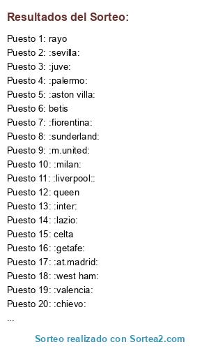 Lista de participantes: :athletic:, :at.madrid:, :fc barcelona:, betis, celta, :depor:, granada, :levante:, :malaga:, :getafe:, rayo, :realmadrid:, :sevilla:, :valencia:, :arsenal:, :aston villa:, :chelsea:, :everton:, :fulham:, :liverpool::, :m.city:, :m.united:, :newcastle:, queen, stoke city, :sunderland:, :totteham:, :west ham:, :catania:, :chievo:, :fiorentina:, :genoa:, :inter:, :juve:, :lazio:, :milan:, :napoles:, :palermo:, :parma:, :roma:, siena, :udinense:.