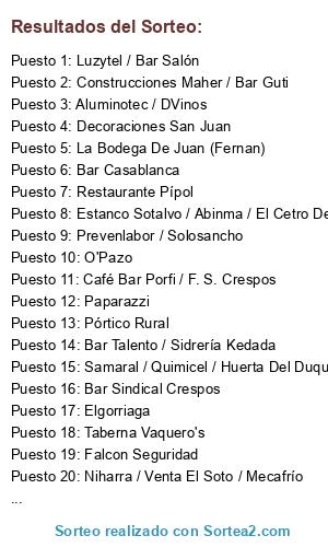 Lista de participantes: Taberna Vaquero's, Tornadizos de Ávila / Deportes Alfonso El Patio, Bar Talento / Sidrería Kedada, Prevenlabor / Solosancho, Bar Sindical Crespos, Restaurante Sanjuaniego / Don Chuletón, Samaral / Quimicel / Huerta Del Duque / Agustina, Oh! Publicidad / Restaurante Rivilla, Restaurante Pípol, Paparazzi, O'Pazo, Niharra / Venta El Soto / Mecafrío, La Mezquita 25º Aniversario, Construcciones Maher / Bar Guti, Luzytel / Bar Salón, Kia Elanmotor, Falcon Seguridad, Camping Los Talleres / Énfasis / Unión, Decoraciones San Juan, Café Bar Porfi / F. S. Crespos, Bar Casablanca, Carseva / Avícola Sánchez / El Riko Pollo, Axa Seguros / Ávila-Rural.com, Aluminotec / DVinos, Estanco Sotalvo / Abinma / El Cetro De Ottokar, La Bodega De Juan (Fernan).