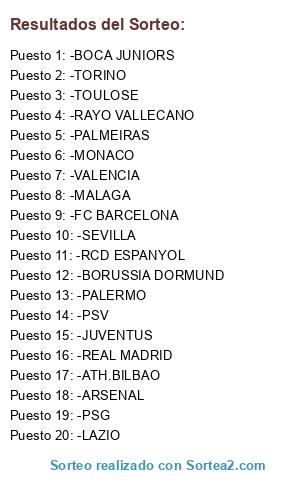 Lista de participantes: -FC BARCELONA, -RCD ESPANYOL, -PSV, -JUVENTUS, -PALMEIRAS, -MALAGA, -RAYO VALLECANO, -TORINO, -SEVILLA, -BORUSSIA DORMUND, -LAZIO, -ATH.BILBAO, -PALERMO, -REAL MADRID, -PSG, -VALENCIA, -MONACO, -BOCA JUNIORS, -ARSENAL, -TOULOSE.