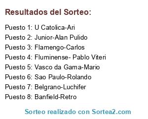 Lista de participantes: U Catolica-Ari, Fluminense- Pablo Viteri, Junior-Alan Pulido, Belgrano-Luchifer, Flamengo-Carlos, Sao Paulo-Rolando, Banfield-Retro, Vasco da Gama-Mario.