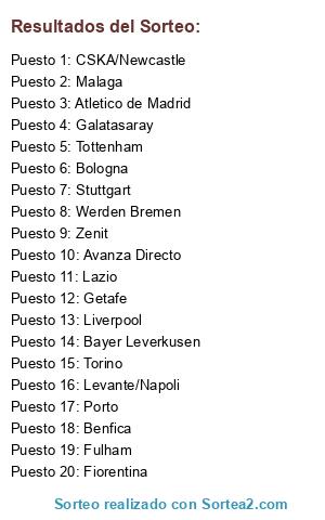 Lista de participantes: Avanza Directo, Torino, Tottenham, Benfica, Liverpool, Fulham, Lazio, Fiorentina, Porto, Getafe, Galatasaray, Bayer Leverkusen, Malaga, Werden Bremen, Zenit, Levante/Napoli, Stuttgart, Bologna, CSKA/Newcastle, Atletico de Madrid.