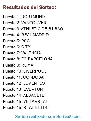 Lista de participantes: JUVENTUS, VANCOUVER, REAL BETIS, ATHLETIC DE BILBAO, VALENCIA, DORTMUND, PSG, FC BARCELONA, CITY, CORDOBA, ALBACETE, REAL MADRID, EVERTON, VILLARREAL, ROMA, LIVERPOOL.