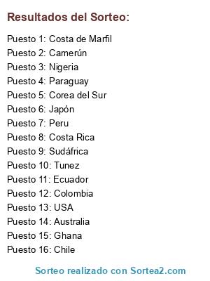 Lista de participantes: Camerún, Costa de Marfil, Ghana, Tunez, Sudáfrica, Nigeria, Costa Rica, USA, Colombia, Chile, Ecuador, Paraguay, Peru, Japón, Corea del Sur, Australia.
