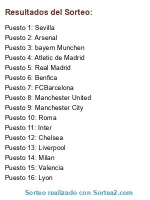 Lista de participantes: Real Madrid, FCBarcelona, Manchester United, Chelsea, Inter, Milan, bayern Munchen, Liverpool, Arsenal, Valencia, Lyon, Roma, Manchester City, Atletic de Madrid, Sevilla, Benfica.