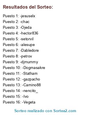 Lista de participantes: -Statham, -Vegeta, -setorvil, -gazpacho, -djmummy, -Ojeda, -Dabledore, -Dogmasakre, -Camino88, -nencito_, -petrov, -hector836, -chac, -alesupe, -jesuselx, -Ivo.