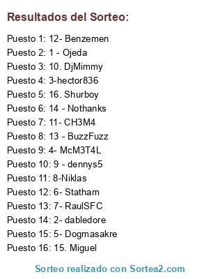 Lista de participantes: 1 - Ojeda, 2- dabledore, 3-hector836, 4- McM3T4L, 5- Dogmasakre, 6- Statham, 7- RaulSFC, 8-Niklas, 9 - dennys5, 10. DjMimmy, 11- CH3M4, 12- Benzemen, 13 - BuzzFuzz, 14 - Nothanks, 15. Miguel, 16. Shurboy.