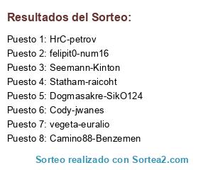 Lista de participantes: Camino88-Benzemen, felipit0-num16, Dogmasakre-SikO124, Cody-jwanes, HrC-petrov, vegeta-euralio, Seemann-Kinton, Statham-raicoht.