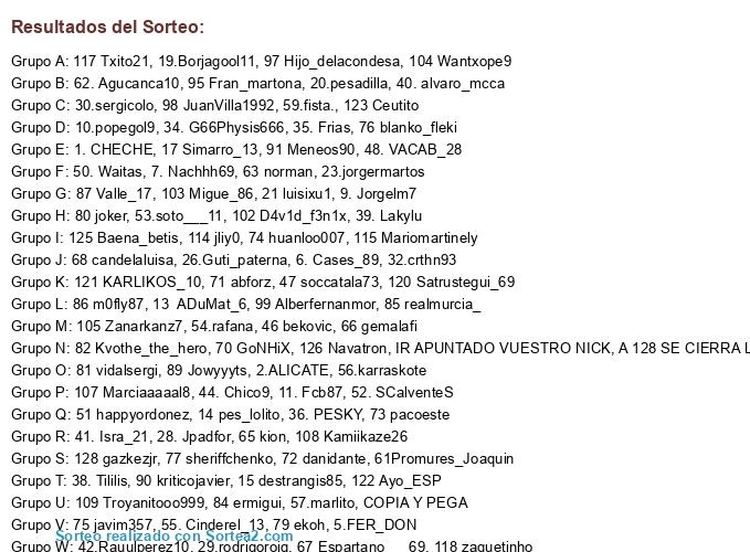 Lista de participantes: IR APUNTADO VUESTRO NICK, A 128 SE CIERRA LISTA., COPIA Y PEGA, 1. CHECHE, 2.ALICATE, 3.LENDERS8, 4.DIEGORDZ82, 5.FER_DON, 6. Cases_89, 7. Nachhh69, 8. Fbou90, 9. Jorgelm7, 10.popegol9, 11. Fcb87, 12.Albertomaliyo, 13 ADuMat_6, 14 pes_lolito, 15 destrangis85, 16 rafitrapo, 17 Simarro_13, 18 Topo1610, 19.Borjagool11, 20.pesadilla, 21 luisixu1, 22.rafabo79, 23.jorgermartos, 24 diasone13, 25.atletico-luiso, 26.Guti_paterna, 27.Hapilukamodric, 28. Jpadfor, 29.rodrigoroig, 30.sergicolo, 31.polinyy, 32.crthn93, 33.pep, 34. G66Physis666, 35. Frias, 36. PESKY, 37. Danielito, 38. Tililis, 39. Lakylu, 40. alvaro_mcca, 41. Isra_21, 42.Rauulperez10, 43. Labestianegra, 44. Chico9, 45.angel_moreno, 46 bekovic, 47 soccatala73, 48. VACAB_28, 49. Sheifor92, 50. Waitas, 51 happyordonez, 52. SCalventeS, 53.soto___11, 54.rafana, 55. Cinderel_13, 56.karraskote, 57.marlito, 58.xaviloko, 59.fista., 60.blincat91, 61Promures_Joaquin, 62. Agucanca10, 63 norman, 64 bit, 65 kion, 66 gemalafi, 67 Espartano___69, 67 blessed_dani6, 68 candelaluisa, 69 juan_angel10, 70 GoNHiX, 71 abforz, 72 danidante, 73 pacoeste, 74 huanloo007, 75 javim357, 76 blanko_fleki, 77 sheriffchenko, 78 farbax, 79 ekoh, 80 joker, 81 vidalsergi, 82 Kvothe_the_hero, 83 Rachet-_-King, 84 ermigui, 85 realmurcia_, 86 m0fly87, 87 Valle_17, 88 Intocable, 89 Jowyyyts, 90 kriticojavier, 91 Meneos90, 92 Vegapes, 93 Jesure9, 94 mokispucela, 95 Fran_martona, 96 o---ALF---o, 97 Hijo_delacondesa, 98 JuanVilla1992, 99 Alberfernanmor, 100 Antonianzas, 101 Cortex_xx, 102 D4v1d_f3n1x, 103 Migue_86, 104 Wantxope9, 105 Zanarkanz7, 106 Metral_10, 107 Marciaaaaal8, 108 Kamiikaze26, 109 Troyanitooo999, 110 Fervilla9, 111 ramonynadia, 112 AdriOrtiz99, 113 Srto_laauu_10, 114 jliy0, 115 Mariomartinely, 116 Mateyita, 117 Txito21, 118 zaquetinho, 119 pablocusan, 120 Satrustegui_69, 121 KARLIKOS_10, 122 Ayo_ESP, 123 Ceutito, 124 Mateocamisa10, 125 Baena_betis, 126 Navatron, 127 Pipo, 128 gazkezjr.
