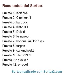 Lista de participantes: famr1989, kist2013, Deivid, boricua_azulon23+2, fernanooh, bardock, orregol, alexxzz, carlonchoskt, Clarkkent1, Kelacoa, turgon, .