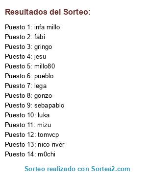 Lista de participantes: pueblo, gringo, sebapablo, luka, jesu, fabi, tomvcp, nico river, infa millo, millo80, lega, mizu, gonzo, m0chi.