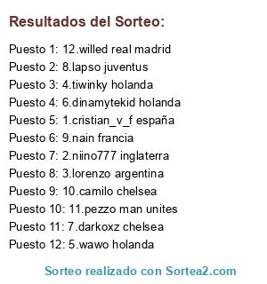 Lista de participantes: 1.cristian_v_f españa, 2.niino777 inglaterra, 3.lorenzo argentina, 4.tiwinky holanda, 5.wawo holanda, 6.dinamytekid holanda, 7.darkoxz chelsea, 8.lapso juventus, 9.nain francia, 10.camilo chelsea, 11.pezzo man unites, 12.willed real madrid.