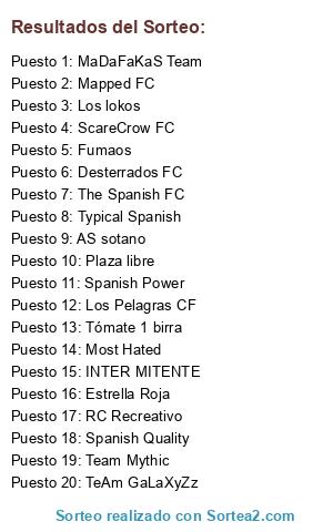 Lista de participantes: Typical Spanish, The Spanish FC, Fumaos, Estrella Roja, Desterrados FC, ScareCrow FC, Most Hated, Mapped FC, Tómate 1 birra, AS sotano, Los lokos, Los Pelagras CF, Team Mythic, MaDaFaKaS Team, INTER MITENTE, Spanish Quality, RC Recreativo, TeAm GaLaXyZz, Spanish Power, Plaza libre.