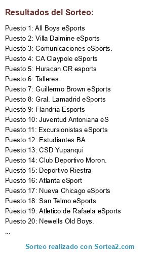Lista de participantes: AAAJ eSports, Union eSports, Talleres, Flandria Esports, Club Deportivo Moron., San Martin de Burzaco eSports, Atletico de Rafaela eSports, CSD Yupanqui, Villa Dalmine eSports, Estudiantes BA, Huracan CR esports, CA Claypole eSports, Nueva Chicago eSports, Excursionistas eSports, Cambaceres, Comunicaciones eSports., San Telmo eSports, Sarmiento, Sacachispas FC, Deportivo Riestra, Atlanta eSport, Defensa y Justicia, Newells Old Boys., Guillermo Brown eSports, All Boys eSports, Juventud Antoniana eS, CA Huracan Esports, CA Brown eSports, Quilmes A.C, Gral. Lamadrid eSports.