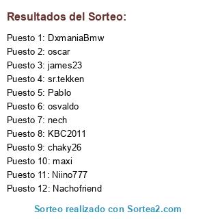 Lista de participantes: KBC2011, sr.tekken, james23, Pablo, oscar, osvaldo, nech, Nachofriend, Niino777, chaky26, maxi, DxmaniaBmw.