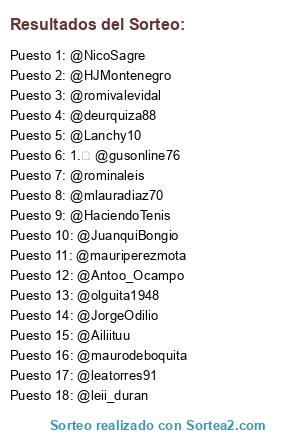 Lista de participantes: 1. @gusonline76, @mlauradiaz70, @mauriperezmota, @leii_duran, @deurquiza88, @HaciendoTenis, @NicoSagre, @rominaleis, @Ailiituu, @maurodeboquita, @leatorres91, @JuanquiBongio, @JorgeOdilio, @HJMontenegro, @romivalevidal, @Lanchy10, @olguita1948, @Antoo_Ocampo.