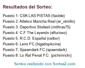 Lista de participantes: Lo Rat Penat F.C. (pichirririchi), Deportivo Stoilesti (mithras75), R.C.D. Español (celtior), Spawndark FC (spawndark), CSK LAS PISTAS (faxilde), C.F The Leyends (elfurioso), Atletico Mancha Real (er_olmillo), Leiro FC (higadopiscina).
