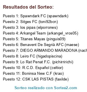 Lista de participantes: Arkangel Team (arkangel_vros05), Benavent De Segrià AFC (maese), Boninsa New C.F (krao), CSK LAS PISTAS (faxilde), Leiro FC (higadopiscina), Lo Rat Penat F.C. (pichirririchi), R.C.D. Español (celtior), Sitges FC (toni92bcn), Spawndark FC (spawndark), Titanes Mayas (pinguis09), DIEGO ARMANDO MARADONA (nachotummi), los pipas (elporrones).