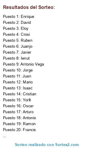 Lista de participantes: Antonio, Antonio Vega, Arturo, Cristian, Crosi, David, Eloy, Alexandra, Emilio, Enrique, Francis, Ienut, Isaac, Javier, Jorge, Juan, Juan Roma, Mario, Marti, Juanjo, Miguel, Moi, Oscar, Pedro, Ramon, Ruben, Yorlli.
