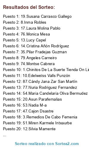 Lista de participantes: 1.Chinitos De La Suerte Tienda On Line , 2.Rafi Diaz Exposito, 3.Remedios De Cabo Femenia, 4.Marina Malaga, 5.Loli Lanza, 6.Mya J-c, 7.Inma Nirmala, 8.Inma Robles, 9.Mary Jose Rdguez, 10.Edelweïss Valls Punzón, 11.Nuria Añón Rodríguez, 12.Silvia Mamente, 13.Lucy Capel, 14.Cristina Añón Rodríguez, 15.Mayte Mangas Ortiz, 16.Vanesa Mata, 17.Laura Molina Pablo, 18.Patricia Lucas Esteve , 19.Susana Carrasco Gallego, 20.Asun Parafernalias, 21.Itziar Lopez Intxaurbe, 22.Nuria Ortiz López, 23.Sandra Piloñeta Fernandez, 24.Sandra Rodriguez, 25.Almudena Mora Rodríguez, 26.Jess Heredia, 27.Shana Rigliatti, 28.Mariana Linares, 29.Con Arte en las Manos, 30.Angeli Rodriguez Peral, 31.Neus Herraiz Lopez, 32.Ana Mira Nóvoa, 33.Cris ML, 34.Julia Gomez, 35.Pilar Fradejas Guzman, 36.Irina Sanchez Rios, 37.Cristina Retamero, 38.Begoña C. Ortega, 39.Marisa Gomez Granell, 40.Esther Gomez, 41.Nerea Zamorano, 42.Viviendo Del Cuento Hand Made, 43.Mónica Rodríguez González, 44.Almudena Santos González, 45.Cajon Dsastre, 46.Marikita Pérez, 47.Cajon Dsastre, 48.Manualidades con fieltro, 49.Ana Bermudez Pelaez, 50.Pascual Puri, 51.Miren Karmele Intxaurbe, 52.Noemi Araujo, 53.Nadia M-a, 54.Maria Candelaria Oliva Bermudez, 55.An Carquinyoli, 56.Ana Bertol, 57.Olga Lorente Moreno, 58.Miren Karmele Intxaurbe, 59.Pilar Gil Costa, 60.MCarmen Alarcón López, 61.Nuria Giraldez, 62.Vanessa Maria, 63.Mari Carmen Lardin Campuzano, 64.Marisa Sánchez López, 65.Ana Cejudo, 66.Angeles Gómez, 67.Lupita Romero, 68.Dinamita Verde, 69.Luisa Simon Remigio, 70.Lady-M, 71.Rosa B. Estevez Bustos, 72.Susana Fernandez Perez, 73.Yolanda Herrero Sanchez, 74.Montse Cabrera, 75.Erun M Rodriguez, 76.Monica Mesa, 77.Nuria Rodriguez Fernandez, 78.Bea Triz Mes Vel, 79.Angeles Carneiro, 80.Fátima Perez, 81.Amparo Caballero, 82.Cukiógenes, 83.Patri Núñez, 84.Lorelay Yo, 85.Marta Vázquez Parcero, 86.Chary Vian, 87.Cándy Jana Zar San Martín, 88.Lourdes Escudero Perez, .