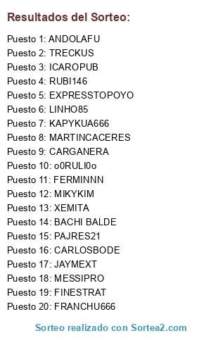 Lista de participantes: BERMEEE, FERMIN, SENZU, SELEEEEE, MATUJK, KIMANY, LINHO, XEMITA, JAIME, FRANLU, JULIOH, SINPLOMO, PAKIU, BRENES, CARLOSBODE, LIBANO ROJO.