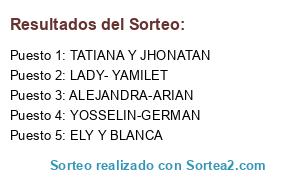 Lista de participantes: ELY Y BLANCA, TATIANA Y JHONATAN, YOSSELIN-GERMAN, ALEJANDRA-ARIAN, LADY- YAMILET.