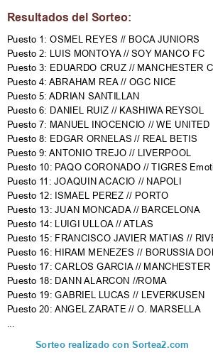 Lista de participantes: MANUEL FERIA // REAL MADRID, ANGEL ZARATE // O. MARSELLA, JUAN MONCADA // BARCELONA, CARLOS GARCIA // MANCHESTER UNITED, EDUARDO CRUZ // MANCHESTER CITY, ALEJANDRO ABOYTES // CHELSEA, MANUEL INOCENCIO // WE UNITED, PAQO CORONADO // TIGRES Emoticón frown, DANIEL DKOP // JAGUARES, EDGAR ORNELAS // REAL BETIS, FRANCISCO JAVIER MATIAS // RIVER PLATE, FELKIN GARCIA // PARIS FC, OSMEL REYES // BOCA JUNIORS, DANIEL RUIZ // KASHIWA REYSOL, GABRIEL LUCAS // LEVERKUSEN, DANN ALARCON //ROMA, LUIS MONTOYA // SOY MANCO FC, ADRIAN SANTILLAN, ANTONIO TREJO // LIVERPOOL, ABRAHAM REA // OGC NICE, HIRAM MENEZES // BORUSSIA DORTMUND, ALEJANDRO COLIN // JUVENTUS, JOAQUIN ACACIO // NAPOLI, LUIGI ULLOA // ATLAS, ALO DELGADO // EC VITORIA, VICTOR FLORES, EDU PH // PSV, ISMAEL PEREZ // PORTO, FRANCISCO ALVARADO // PUMAS, CHANKING GOLDEN // NECAXA, ADRIAN GUERRERO // LEONES NEGROS, JORDO FLORES //.