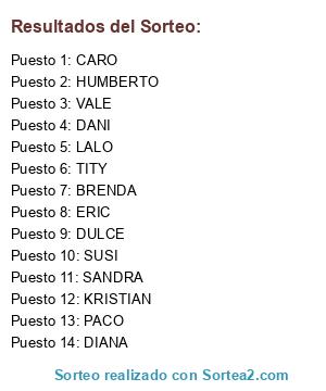 Lista de participantes: TITY, PACO, VALE, SANDRA, KRISTIAN, ERIC, HUMBERTO, DIANA, CARO, SUSI, LALO, DANI, DULCE, BRENDA.