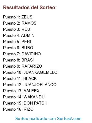 Lista de participantes: ADMIN, AALEEX, DON PATCH, WAKANDU, RUU, ZEUS, BLACK, RAMOS, BUBO, RIZO, JUANKAGEMELO, PERI, JUANJOBLANCO, BRASI, DAVIDIHO, RAFARIZO.