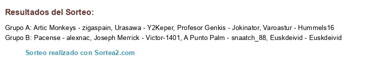 Lista de participantes: Pacense - alexnac, Joseph Merrick - Victor-1401, Profesor Genkis - Jokinator, A Punto Palm - snaatch_88, Urasawa - Y2Keper, Artic Monkeys - zigaspain, Euskdeivid - Euskdeivid, Varoastur - Hummels16.