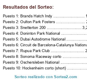 Lista de participantes: Brands Hatch Indy ............................ 1,92km, Hockenheim corto (short) ..................... 2,63 km, Zolder ....................................... 4,01 km, Cadwell Club Circuit ......................... 3,37 km, Doninton Park National ....................... 3,14 km, Willow Spring International Race way ......... 4,02 km, Sonoma Raceway corto ......................... 3,13 km, Rupua Park Club .............................. 2,38 km , Walking Glend ................................ 4,06 km, Circuit de Barcelona-Catalunya National ...... 3,06km, Autodromo Nazionale Monza corto .............. 2,45 km, Dubai Autodrome National ..................... 3,58 km, Nurburgring Sprint corto ..................... 3,06 km, Oschersleben National ........................ 2,43 km, Oulton Park Fosters .......................... 2,65 km, Sakitto International ........................ 2,84 km, Silverstone National .............,,.......... 2,63 km, Snetterton 200 ............................... 3,22 km.